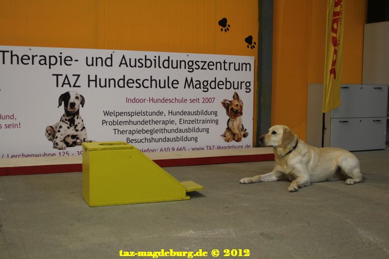 Nero liegt vor der Flyball-Kiste ab